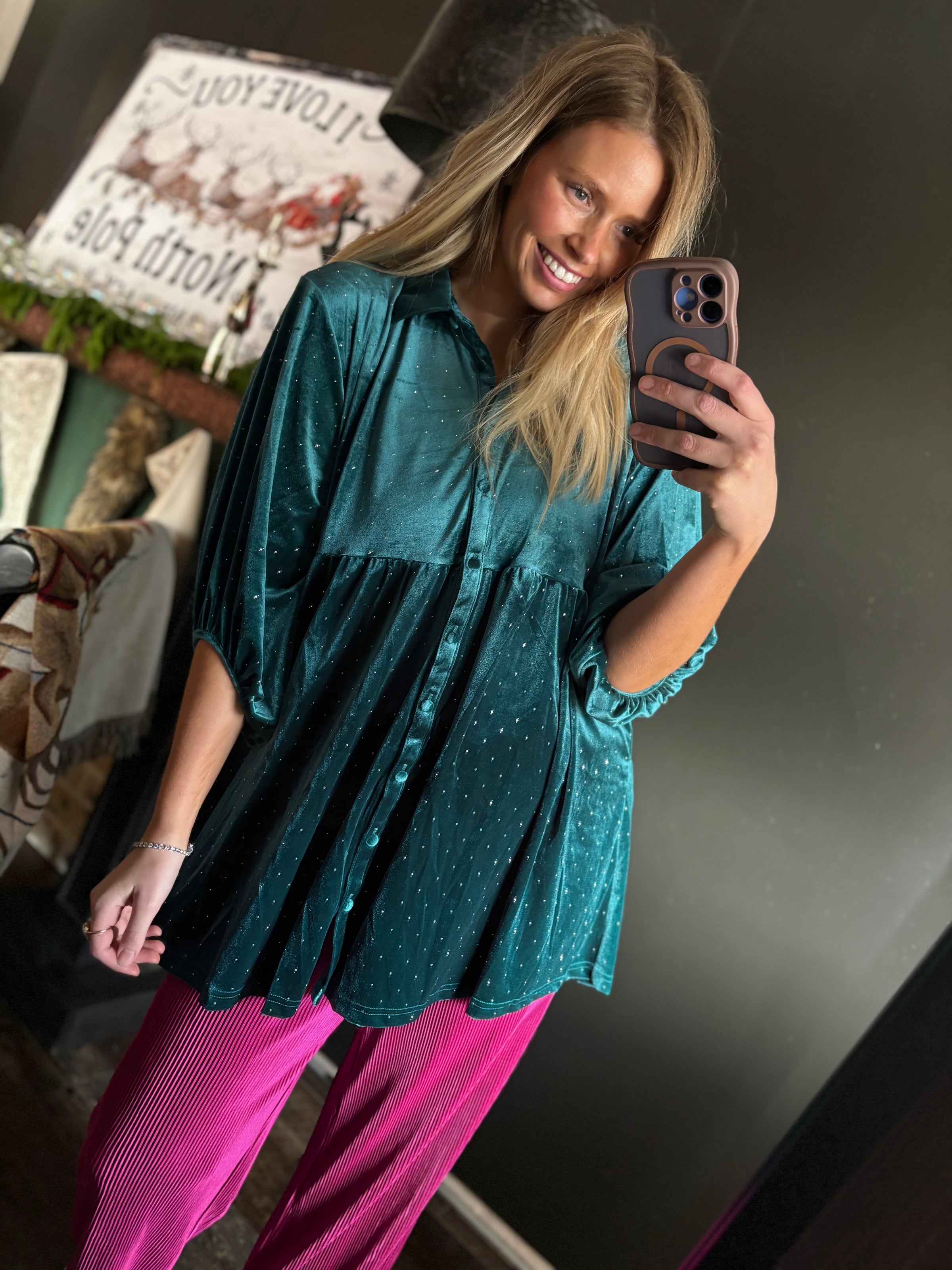 W174 Velvet Green Tunic with Sparkle SKU: Size: Small Small Medium Large Choose Option Small - $28.00 Medium - $28.00 Large - $28.00 Added to Cart View Cart or Continue Shopping. Cart Error Some items became unavailable. Update the quantity and try again. Decrease Quantity Increase $28.00 $28.00 On Sale Now Sold Out Add to Cart This item is a recurring or deferred purchase. By continuing, I agree to the cancellation policy and authorize you to charge my payment method at the prices, frequency and dates listed on this page until my order is fulfilled or I cancel, if permitted. Share Facebook Twitter Pinterest